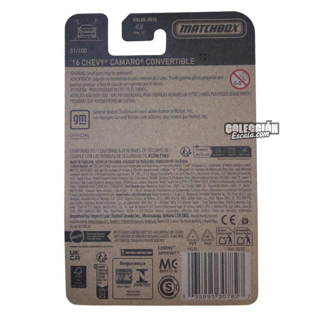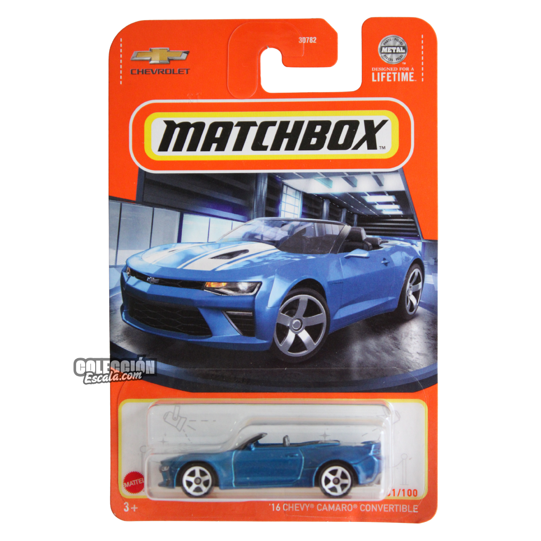 Muscle car moderno con estilo libre. El Chevy Camaro Convertible 2016 de Matchbox en escala 1:64 combina potencia americana y diseño abierto para lucirse en cualquier colección. Pura facha sobre ruedas.